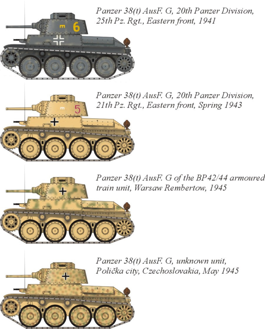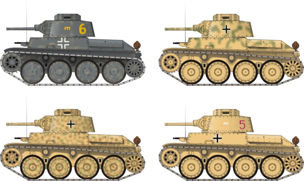 Paper model originally Czechoslovak tank Lt.38 in German service. Tanks are in four color versions.