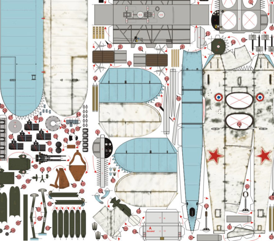 Paper model of the Polikarpov Po-2, Po-2 served as a general-purpose Soviet biplane. This model represents the plane used on Eastern Front by the Frenchs in Normandie-Niemen unit.