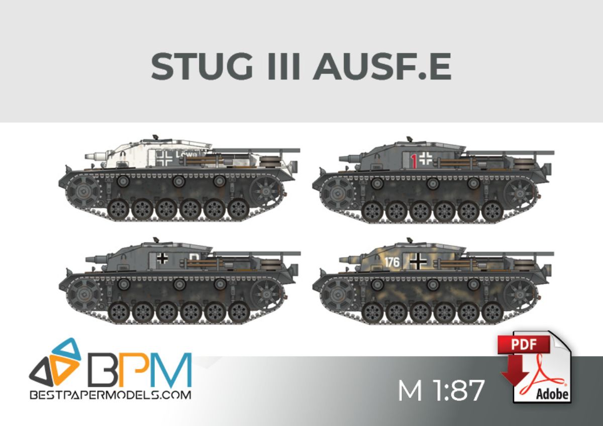 Paper model of the German assault cannon Stug III Ausf.E, which was the most mass-produced armored machine of the Wehrmacht. Version E was used at the beginning of World War II. The cut-out includes 4 different color variants.