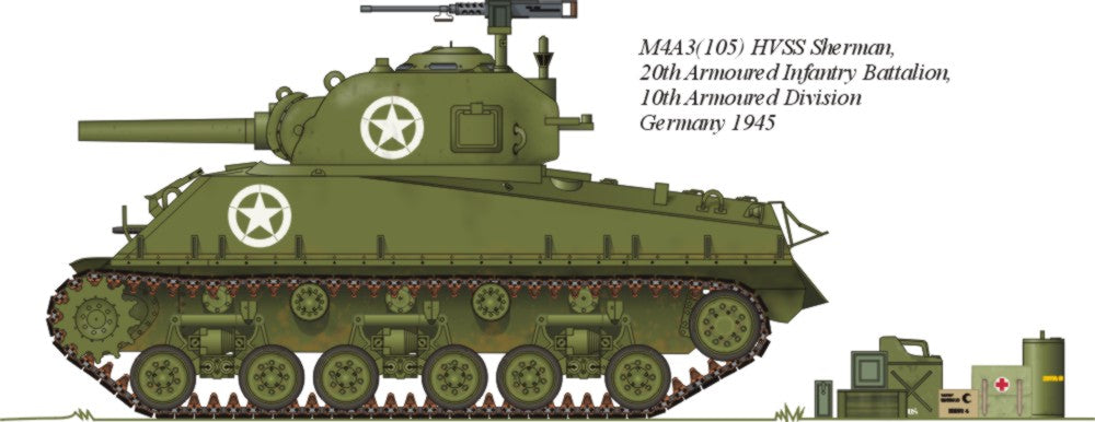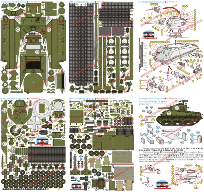 Paper model of the Sherman tank in the M4A3 variant with horizontal suspension and a 105 mm cannon. The model also includes US Army accessories.